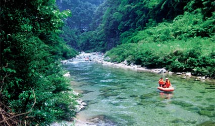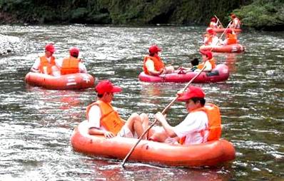 第二天一早大家就迫不及待地背上行囊准备出发,下车后约四十分种行程,我们便进入丛山腹地。河床上早己布满了前来漂流的游人以及橡皮艇、救生衣等。这里不再需要办理任何手续,每二人即可取一艘橡皮艇与一根木棍开始这欢乐的旅程。经过半小时的路程,我们看见河滩上摆满了烧烤,早已按赖不住饥饿的业之峰人三三两两地围着烧烤摊品尝着山间美味,品尝过山间美味之后,大家又继续往前行,我们不知经过几番山移水转,多少沟沟坎坎,终于来到一处豁然开阔的水面,峡谷到这里也到了尽头,山势向两面延展开去,远处的河岸边出现了粮田,我们终于到达了终点。